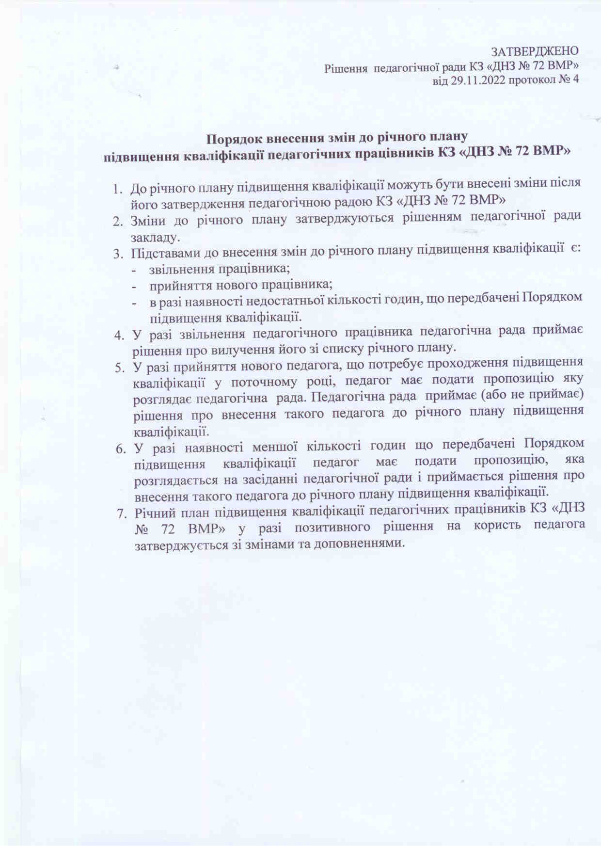 Порядок внесення змін до річного плану підвищення кваліфікації педагогічних працівників КЗ "ДНЗ № 72 ВМР"